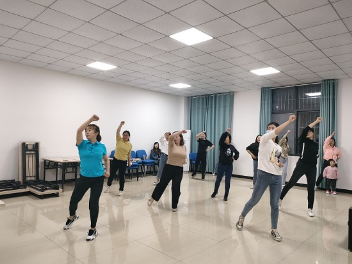室内健身操,爱好舞蹈的学员们,跟着节拍有韵律的舞动起来,在活动中,大家增进了友谊,激发了活力,调节了紧张的学习气氛。
