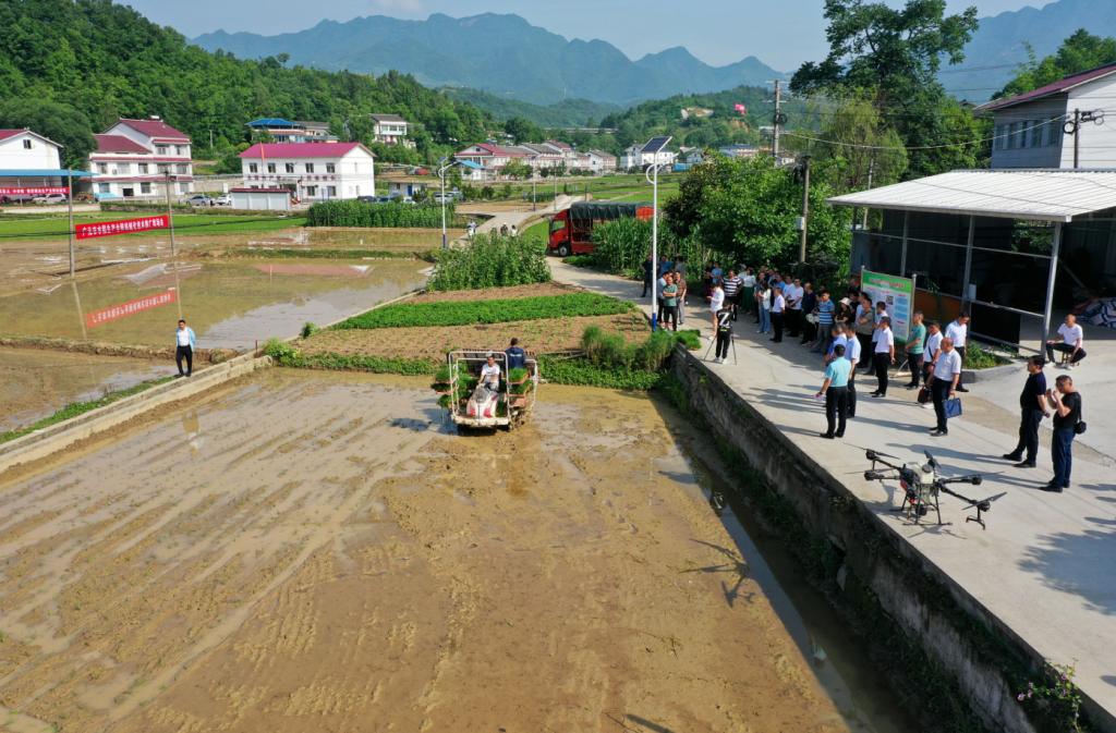 灿烂的阳光下,开着乘坐式插秧机在连片平坦的田地间来回穿梭,插秧机边走边种,不一会儿,秧苗已经被整齐划一地插到田间……6月7日,广元市水稻生产全程机械化现场会在朝天区中子镇举行,技术人员现场演示了水稻关键环节机械化作业。
