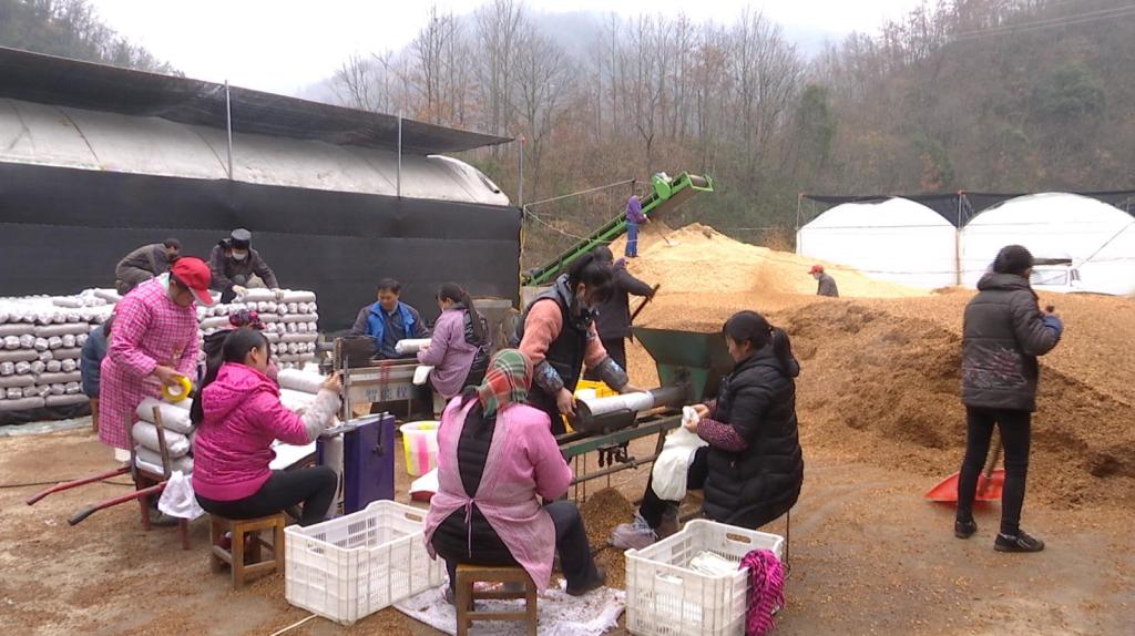 在云雾山镇花石村食用菌产业示范园内,村民们正忙着粉碎木屑、浇水、装袋、摆放,忙得热火朝天。作为劳动密集型产业,在香菇种植过程中,周边的留守妇女和老人便成了香菇基地的“产业工人”。
