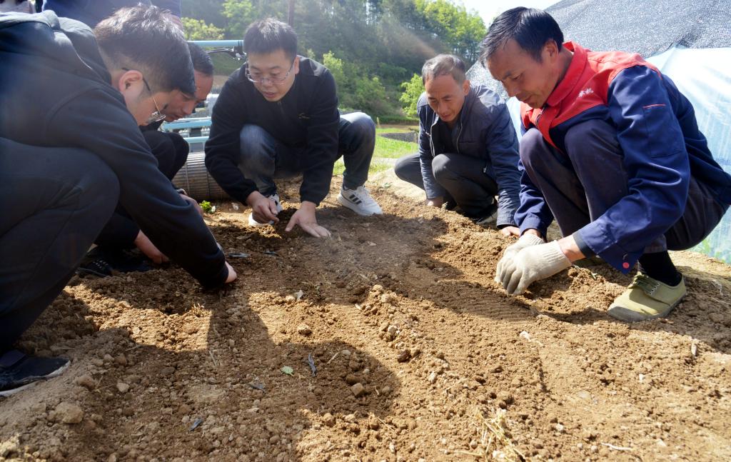 添加种子,发动机器后,农机专家王立峰熟练地操作着气吸式精量播种机进行豆角的播种,另一名专家言育谦跟随在左右,用手机拍摄照片和视频,将机器前进的速度、播种间距、播种深浅等数据仔细记录下来,一个来回之后,停下蔬菜播种机,专家们蹲在地上,用手刨开种子上面的土层,查看着播种深度、株距、间距等。