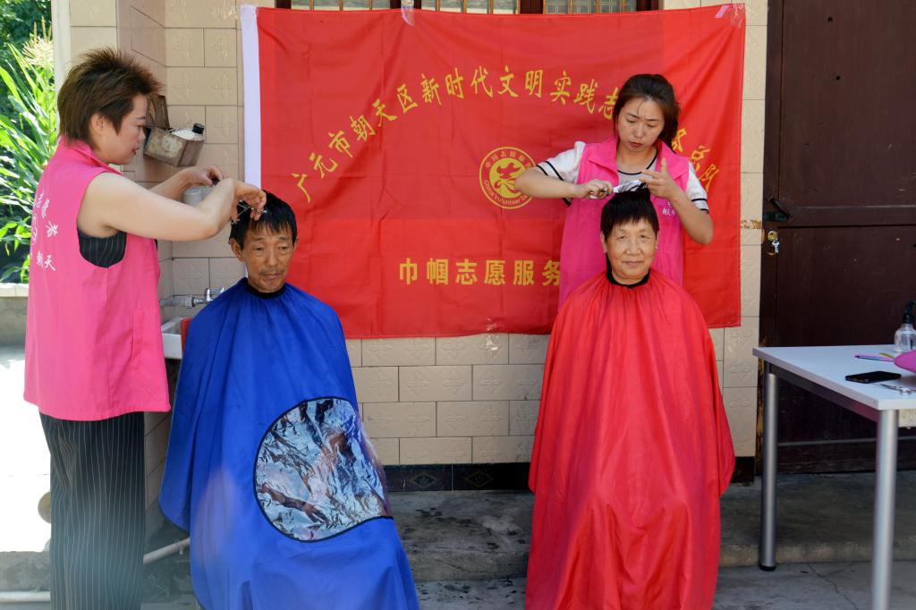 “大爷,夏天热,我给您把头发稍微理短一点。”“叔,您先坐一下,马上给您剪。”……巾帼志愿服务支队的志愿者对理发工具进行消毒处理后,立刻就投入到了紧张地工作之中。她们个个动作娴熟、细心认真,干劲十足。为群众理发的同时,志愿者们还和他们亲切聊天,询问他们的生活状况和身体情况,并叮嘱前来理发的老年人一定要保重身体,保持良好的心态,现场气氛十分温馨热闹,欢声笑语不断。