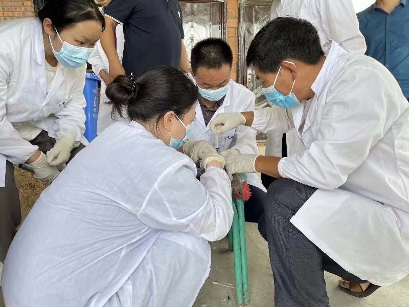 在羊木镇鼎盛农业科技有限公司、界坤家庭农场等地方,技术人员通过贯穿牛、羊、鸡等家禽动物疫病防控抽血采样技术为重点,针对家畜、家禽采样操作流程、采样部位以及血液的保存和注意事项等进行现场示范教学。