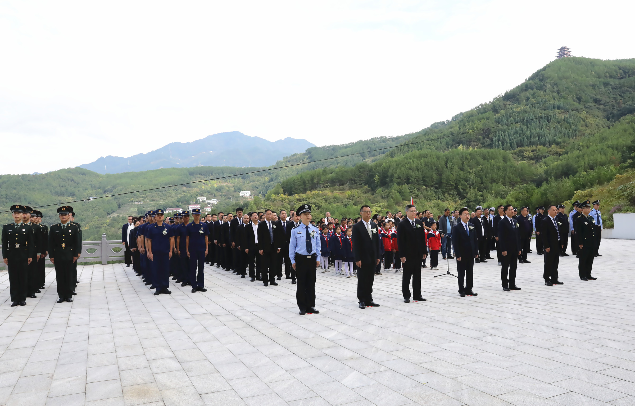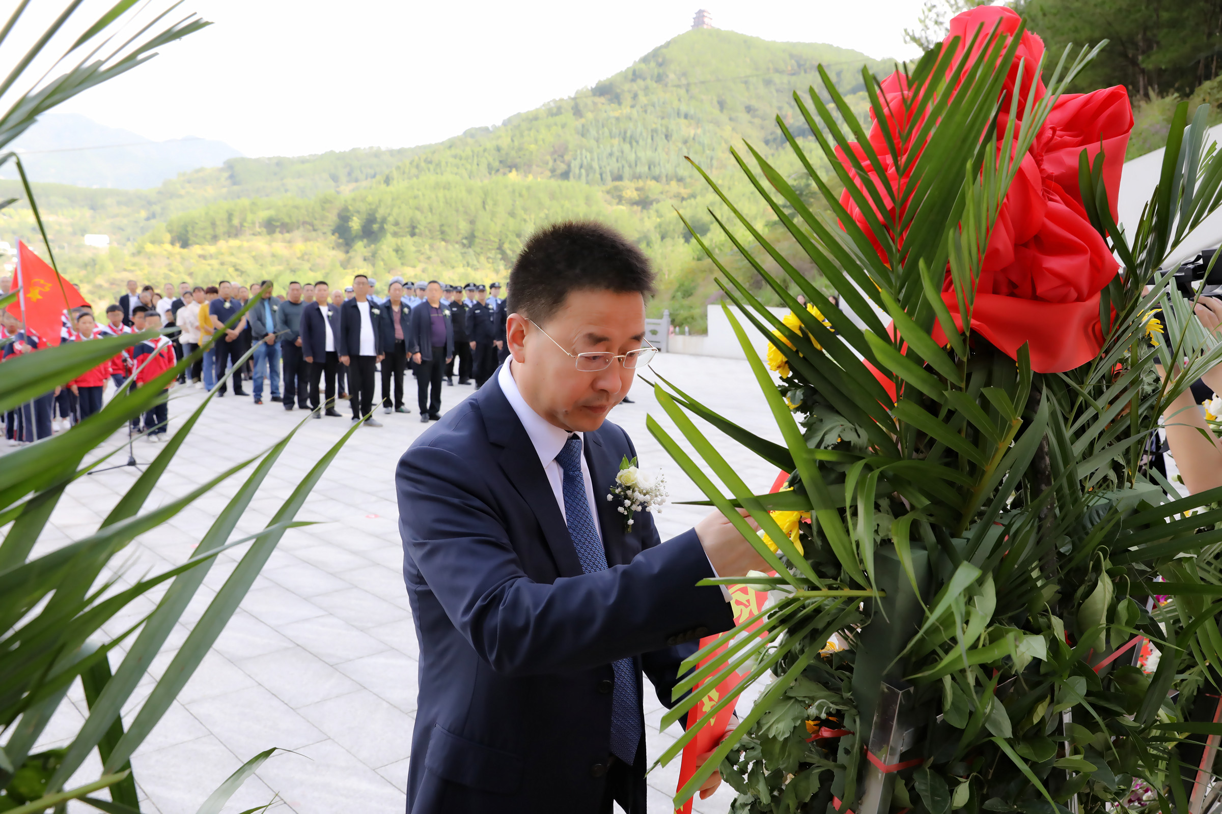 区领导仲满成、山涛、何澜,区级相关部门主要负责同志,驻朝部队官兵、民兵代表,少先队员代表,公安干警代表,烈士遗属、退役军人代表,消防救援代表参加敬献花篮仪式。