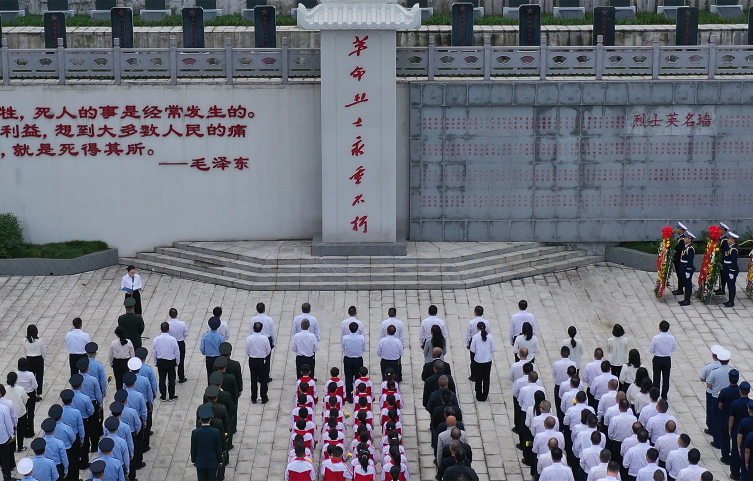 烈士陵园在青山与苍松翠柏的环绕下显得格外庄严肃穆,高耸的烈士纪念碑巍然屹立,碑身正面镌刻的“革命烈士永垂不朽”八个红色大字,苍劲醒目、熠熠生辉。全区各界代表手持鲜花,面向这座纪念碑整齐列队,共同缅怀革命先烈,整个陵园弥漫着凝重而庄严的气氛。