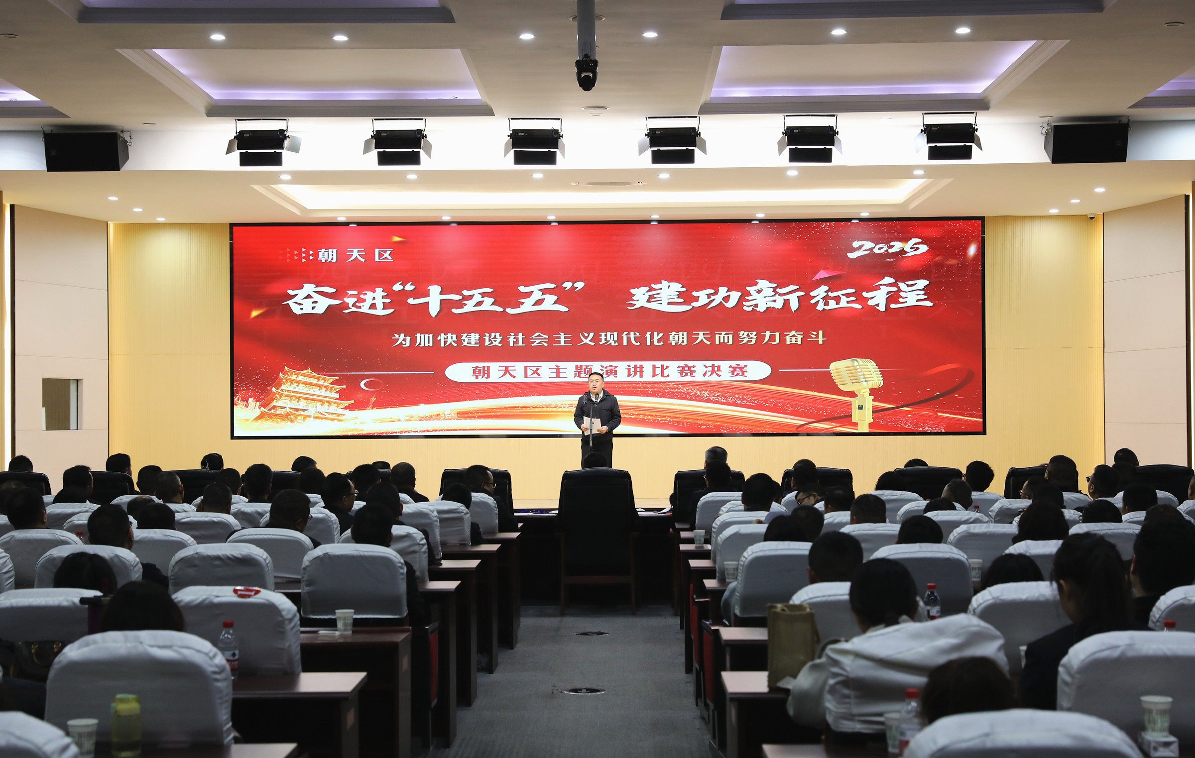 郭祖炎在致辞中指出,“十五五”时期是基本实现社会主义现代化夯实基础、全面发力的关键时期,2026年作为“十五五”开局之年,举办本次演讲比赛,既是丰富学习形式的务实行动,也是区委、区政府发现培养“会写、会讲、会干”优秀干部、夯实队伍建设的重要抓手。他强调,区委、区政府始终坚持“不搞形式、务求实效”的工作导向,将演讲比赛、写作比赛、干部民主评议、单位主要负责同志推荐等多种形式有机结合,通过多维度、大数据分析,精准发现和培养群众认可的优秀干部。他勉励全体参赛选手,要以赛为媒、以赛促学、以赛促干,在比赛中锤炼本领、展现风采,把比赛中的收获转化为履职尽责、干事创业的实际行动,以实干实绩为朝天“十五五”开局起步贡献力量,书写新时代奋进篇章。