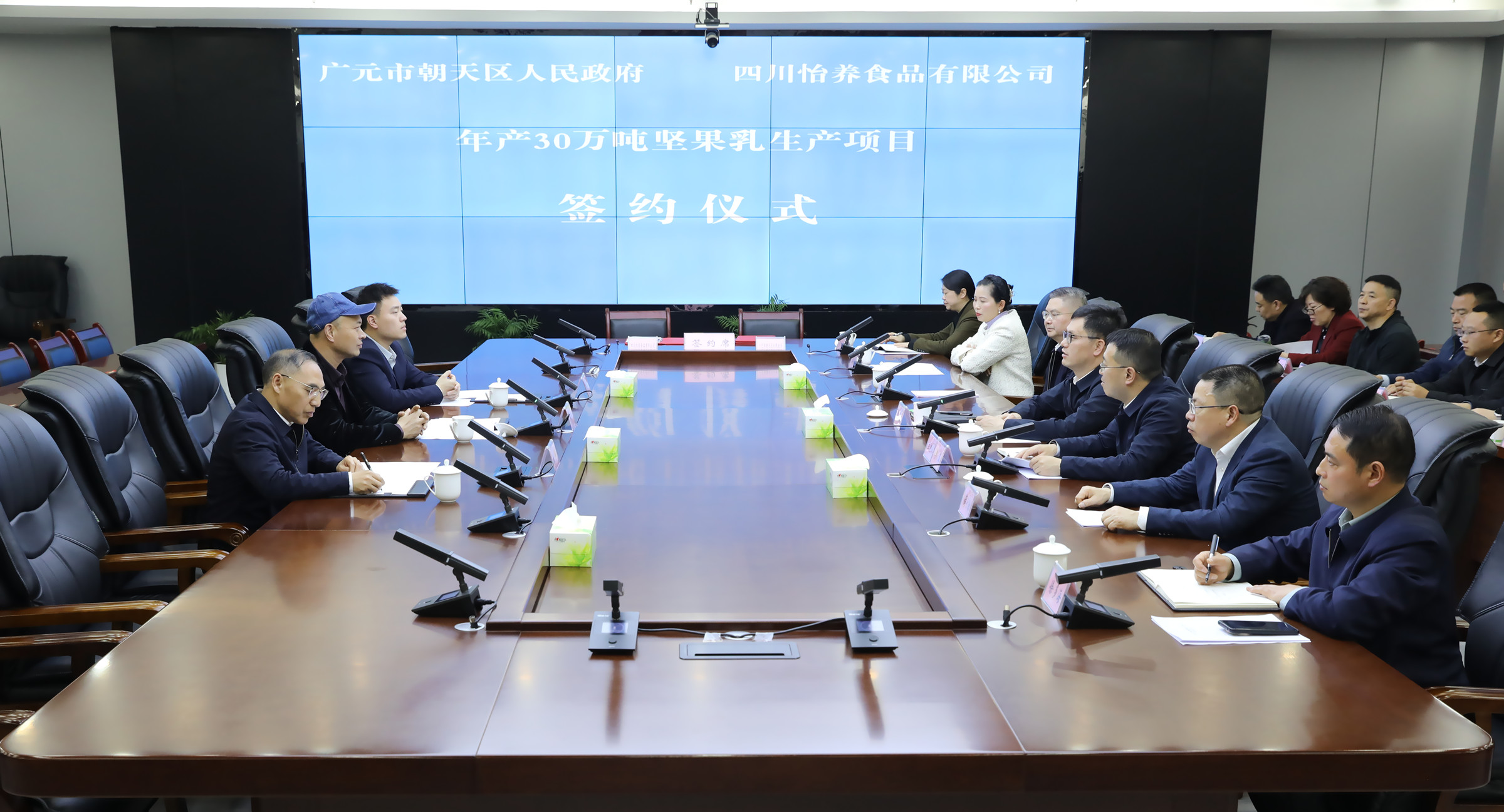 3月30日上午,朝天区年产30万吨坚果乳生产项目签约仪式举行。区委书记郭祖炎出席并讲话,区委副书记、区长李磊主持仪式。四川怡养食品有限公司董事长干晓春,总经理干镇豪,法律顾问程晓;区人大常委会主任张开翅、区政协主席薛长勋出席签约仪式。