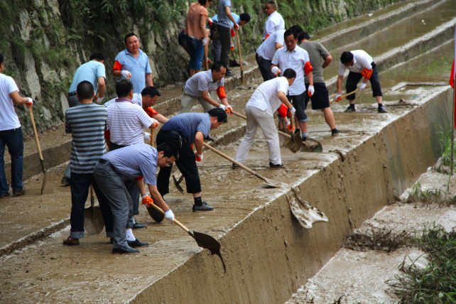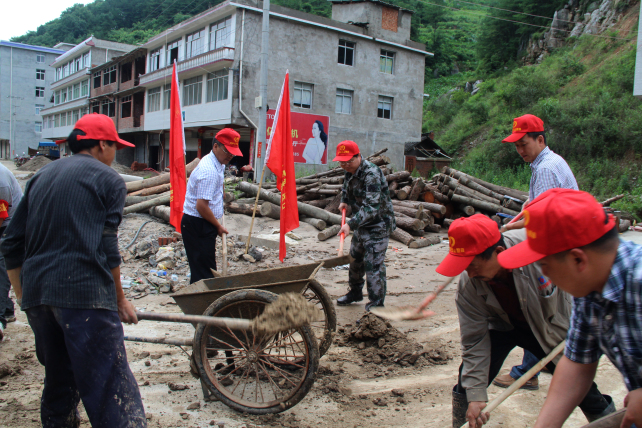 在“6.20”洪灾最严重的两河口乡,50余名共产党员志愿者全力帮助受灾户搬运家什、清理淤泥、发放救助物资、填埋水灾致死的家畜、家禽等。党员志愿者余仕军说:“接下来,我们将继续做好抗灾救灾和消杀灭工作,确保受灾群众早日恢复正常生活。”