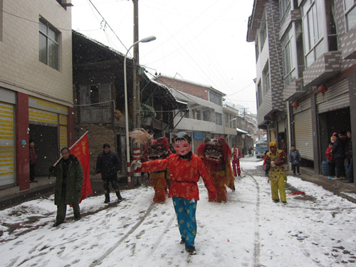 舞狮队和锣鼓队在场镇给老百姓拜年