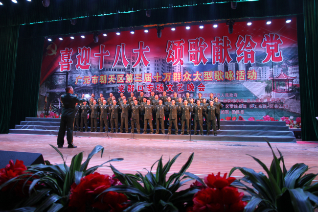 (刘保刚)曲曲红歌映丹心,缕缕心声表深情。9月28日晚,朝天影剧院灯光璀璨,歌声如潮,朝天区党群口“喜迎十八大,颂歌献给党” 大型歌咏专场晚会隆重举行。蔡邦银、伏玉琼、梁黎、贾光升、卢达昌等在家的区四大班子领导与广大干部群众一起欢聚一堂,用深情的歌声向党表达无限感恩之情。至此,朝天区第三届十万群众大型歌咏活动画上圆满句号。区委常委、宣传部长张大鸿致辞。