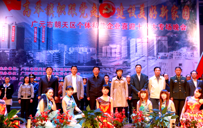 本网讯(谢翀)10月25日晚,由朝天区工商行政管理局主办的“高举旗帜跟党走·建设美好新家园”个体私营企业喜迎十八大专场晚会隆重举行。来自全区个体私营企业代表们以饱满的热情,表达出了改革开放和我区富民强区政策给个体私营企业带来的新希望、新发展和新变化。区委书记蔡邦银,区委副书记、区长伏玉琼,区政协主席贾光升,区委副书记卢达昌及在家的四大班子领导观看演出。