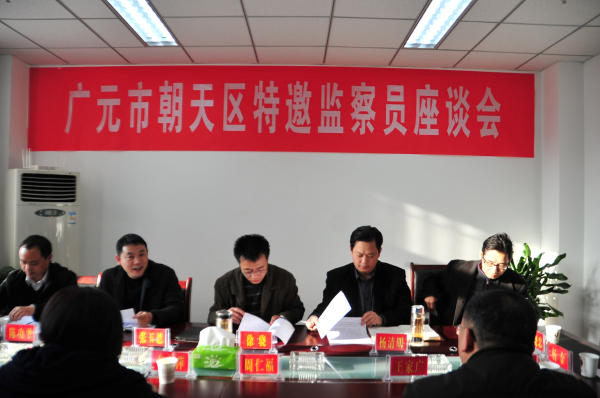 (区纪委)12月5日,朝天区召开特邀监察员座谈会,会议通报2012年我区反腐倡廉工作情况,并就如何做好近期特邀监察员工作进行安排部署;听取了特邀监察员对党风廉政建设工作和行政监察工作的意见和建议。区委常委、副区长徐骁参加座谈会并讲话。