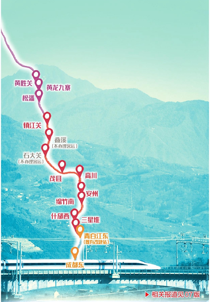 川青铁路是我国“八纵八横”高铁网中兰州、西宁至广州通道的组成部分,路网地位十分重要。线路起自成都东站,接入青海省西宁站,正线全长约836公里,设计时速200公里。全线分段建设,成都东至青白江东段、青海省的海东西至西宁段已投入运营。本次开通段起自松潘县镇江关站,途经叠溪、茂县、安州、绵竹南、什邡西、三星堆等站,接入青白江东站,正线全长206公里。该段处于成都平原向青藏高原东部边缘过渡的高山峡谷地带,海拔高差超2000米,穿越龙门山、岷山、西秦岭等山脉,跨越涪江、岷江、嘉陵江三大水系,项目自2011年开工建设,历经12年艰辛终于建成。预计2024年,镇江关至黄胜关段将开通,届时铁路将通达松潘、黄龙九寨站。待全线建成开通后,成都至西宁铁路旅行时间预计缩短至4.5小时。