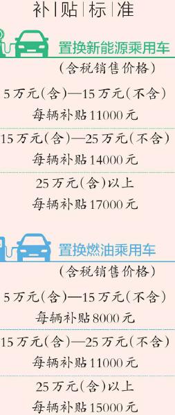 购买燃油乘用车的,含税销售价格5万元(含)—15万元(不含)的,每辆补贴 8000 元;15 万元(含)—25万元(不含)的,每辆补贴11000元;25万元(含)以上的,每辆补贴15000元。