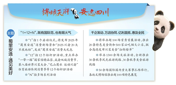 “1”指1个启动仪式,9月25日晚在成都启动本次消费节。现场将发布2025年“蜀里安逸”消费新场景和“2025川渝20大不夜地标”,发放“蜀里安逸”消费大礼包。