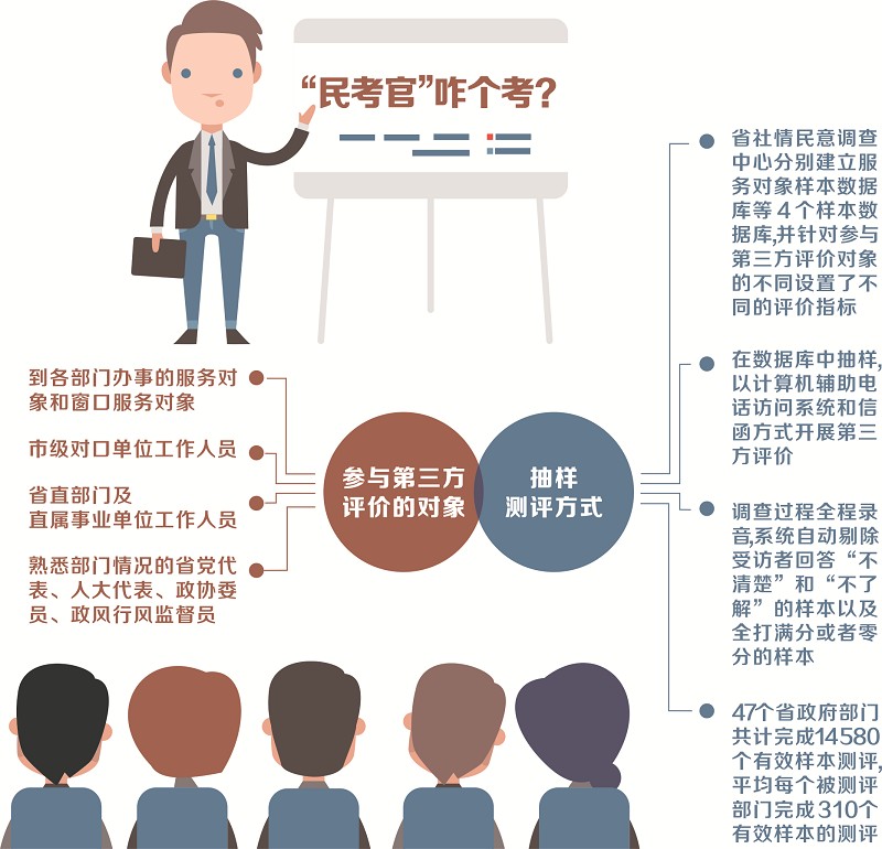 日前,涉及省政府47个部门、涵盖四类调查对象31个评价指标的2015年省政府部门绩效管理社会公众评价调查出炉,这是我省首次将第三方评价机制引入省政府部门绩效评价的新尝试,也是贯彻落实十八届三中全会提出的“完善发展成果考核评价体系”精神,推进“民考官”机制的新探索。