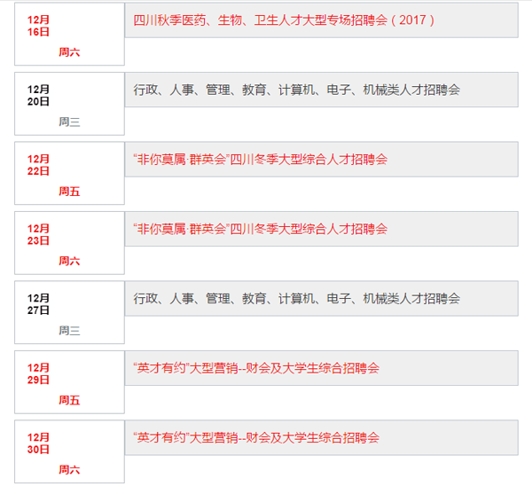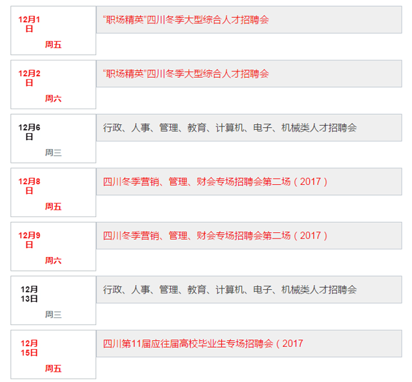 其中,综合型人才招聘会包括12月1日至2日的“职场精英”四川冬季大型综合人才招聘会,12月8日至9日的四川冬季营销、管理、财会专场招聘会第二场(2017),12月22日至23日的“非你莫属.群英会”四川冬季大型综合人才招聘会。
