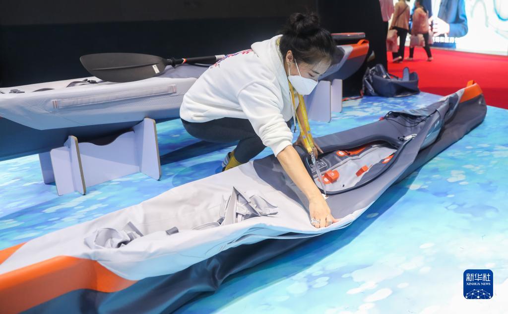 工作人员在第三届中国国际进口博览会消费品展区的迪卡侬展台演示可折叠皮划艇如何安装(2020年11月6日摄)。新华社记者 丁汀 摄