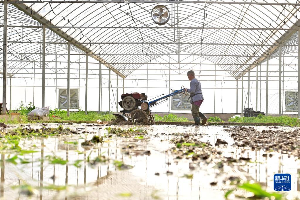 1月29日,在湖南省娄底市双峰县青树坪镇归古新村,农民驾驶农机在大棚内整地。新华社发(李建新 摄)