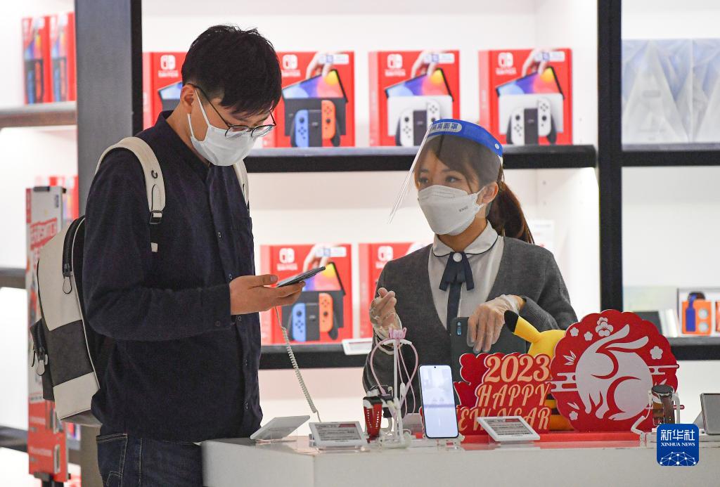 1月19日,消费者在中免集团海口日月广场免税店选购电子产品。新华社记者 蒲晓旭 摄