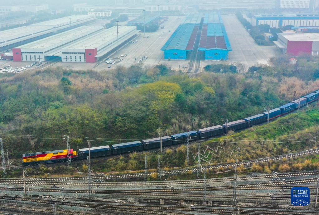 1月22日,农历新年首趟西部陆海新通道铁海联运班列从重庆团结村中心站发车(无人机照片)。新华社记者 刘潺 摄