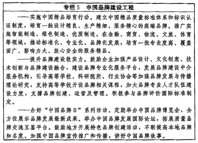 ——品牌建设取得更大进展。品牌培育、发展、壮大的促进机制和支持制度更加健全,品牌建设水平显著提高,企业争创品牌、大众信赖品牌的社会氛围更加浓厚,品质卓越、特色鲜明的品牌领军企业持续涌现,形成一大批质量过硬、优势明显的中国品牌。
