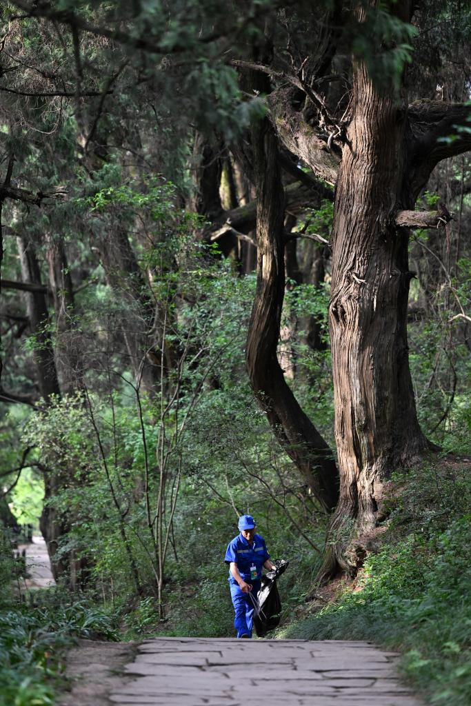 日前,一名清洁人员在四川省广元市剑阁县翠云廊景区捡拾枯枝落叶。新华社记者刘坤摄