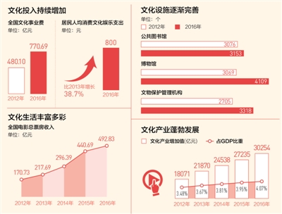 党的十八大以来,文化体制改革深入推进,现代公共文化服务体系日益完善。目前,全国“三馆一站”公共文化服务设施全部免费开放;广播电视村村通、文化信息资源共享、农家书屋等重大文化惠民工程深入实施,公共文化服务能力和普惠水平不断提高。2016年全国文化事业费为770.69亿元,2012年为480.10亿元。党的十八大以来,全国文化事业费的年平均增速超过10%。