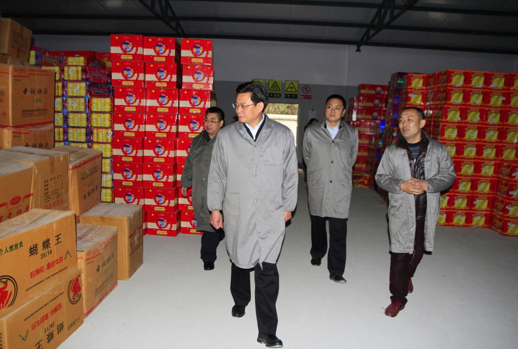 在朝天烟花爆竹专营公司仓库,蔡邦银详细检查烟花爆竹分类、分库存放、安全堆码、流向登记、消防设施等情况。他要求,要强化日常管理,切实加强对仓库管理人员的安全培训和进出库车辆及人员的管理,严格按国家标准存放烟花爆竹;要认真做好自检自查,严格值班值守,全方位排查安全隐患,严防安全事故发生。同时,监管部门要进一步强化责任制落实,严格执行安全管理制度和操作规程,确保烟花爆竹市场安全稳定有序。