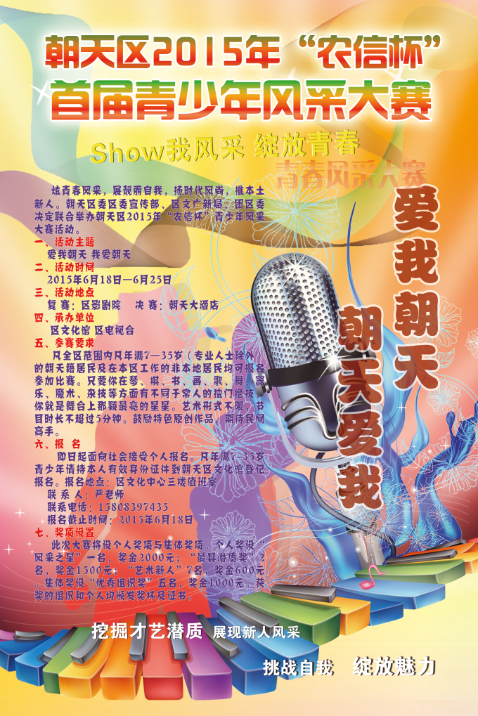 为深入学习贯彻党的十八大及十八届三中、四中全会精神,引导全区广大青少年积极践行社会主义核心价值观,激发广大青少年建成全面小康和建设美丽朝天的火热激情,为全区青少年提供一个展示才艺和精神风貌的舞台,区委宣传部、区文广新局、团区委将联合举办朝天区2015年“农信杯”青少年风采大赛活动。