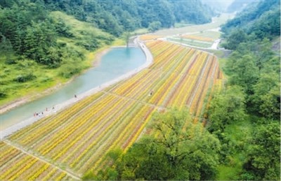 花千谷,青山连绵,密林深邃,田野盎然,绿水穿行。400亩的大田花海争奇斗艳,以荷兰百合为主。一朵朵、一行行、一片片,热热闹闹,生机勃勃。