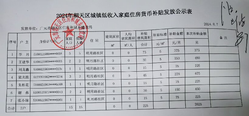 2024年朝天区城镇低收入家庭住房货币补贴发放公示表