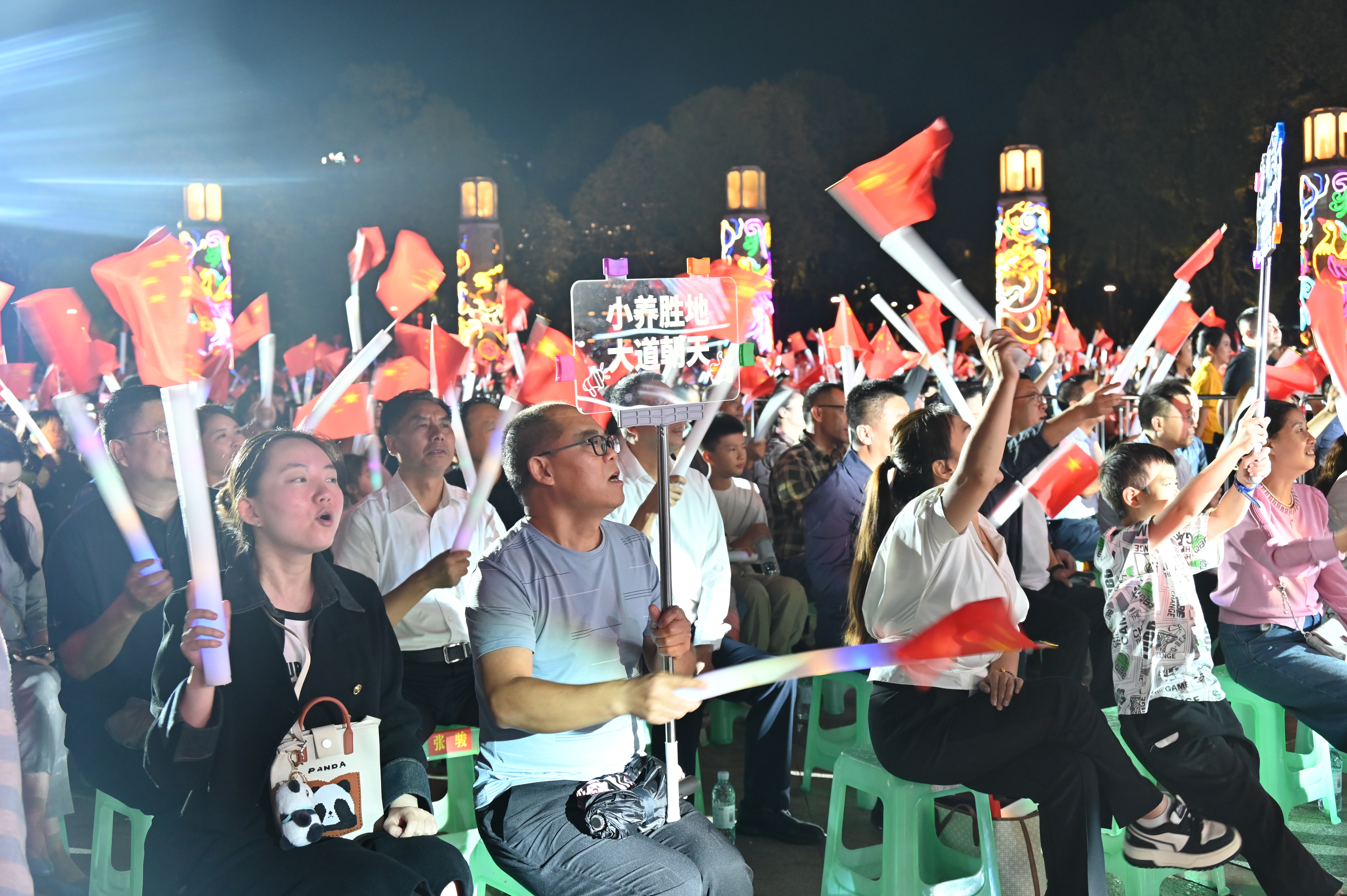 活动最后,《我爱你中国》的激昂旋律响起,全场观众不约而同站起身来,挥动手中的小红旗,共同唱响对祖国的祝福,歌声响彻嘉陵江畔,将活动氛围推向顶峰。
