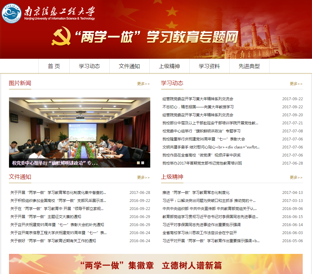 南京信息工程大学在学校官方网站主页开设爱国主义教育专栏和学习专栏,充分利用官方微信、微博平台的优势,在准、新、微、快上下功夫,让学生对爱国主义教育内容随时随地学起来、动起来。学校官网还先后开展了一系列爱国主义活动,广大学生积极参与,活动网络点击量突破万余次,取得了很好的教育效果。