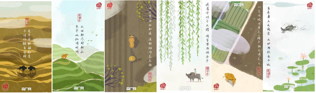 由单张海报延伸出的系列组图,主题、色调、风格整齐划一,能够利用多图集中优势进行“团队作战”,实现能量叠加效果。《政府工作报告,这些话暖心又提气!》《一组数据了解2021中国KPI》通过提炼政府工作报告中的重点内容,将碎片化信息汇聚成系列,提升了信息的完整度;春节期间,央广网在全端口推出的系列海报《犇!》以“奋斗牛”“老黄牛”“拓荒牛”“孺子牛”“知足牛”“逍遥牛”六个形象,共同组成了新时代的精神画像。