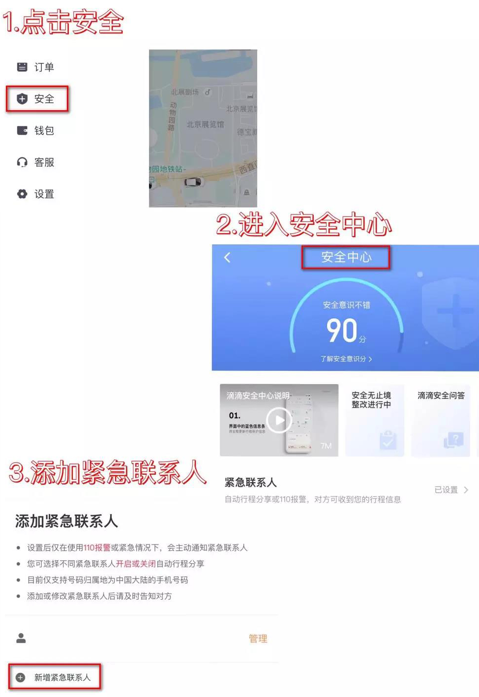 将家人或朋友设置为紧急联系人,并开启“自动分享行程”功能。车牌号、司机信息和行驶进度等行程信息会通过短信自动分享给紧急联系人,帮助家人朋友实时在线掌握乘客所处的位置和状态。