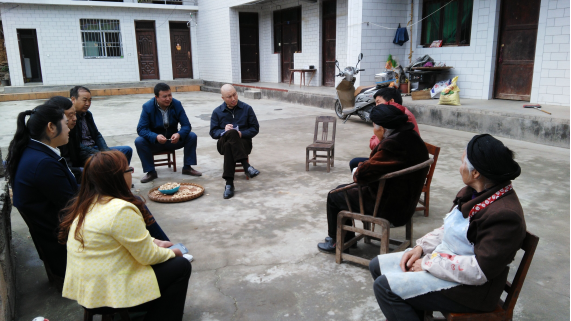 朝天区政协农业委主任赵家贵(右四)为挂联帮扶户讲脱贫政策