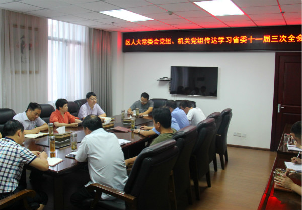 7月4日,区人大常委会党组、机关党组召开会议,专题传达学习省委十一届三次全会精神。区人大常委会主任梁黎主持会议并讲话,区人大常委会副主任田新华、邝庆林、张满德、机关全体干部职工参加会议。