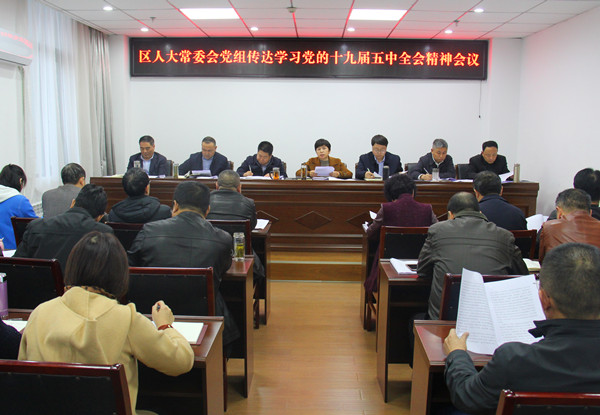 会议组织学习了中国共产党第十九届中央委员会第五次全体会议公报,传达了市委常委、区委书记蔡邦银关于传达贯彻十九届五中全会精神的要求。会议要求,要充分认识党的十九届五中全会召开的重大意义,深刻领会“十三五”以来决胜全面建成小康社会取得的决定性成就,切实增强“四个意识”、坚定“四个自信”、做到“两个维护”。要把学习贯彻党的十九届五中全会精神作为当前和今后一个时期的重大政治任务,按照市委常委、区委书记蔡邦银提出的贯彻要求,组织机关各级党组织、全体党员干部认真学习好党的十九届五中全会精神特别是习近平总书记的重要讲话精神,深刻领会好党的十九届五中全会精神实质,自觉把思想和行动统一到全会精神和党中央决策部署上来。要充分发挥各级人大代表的作用,组织宣传好党的十九届五中全会精神,不断增强政治责任感和历史使命感,迅速兴起学习宣传贯彻热潮。要依法履职尽责,统筹做好“十四五”规划纲要的前期调研、明年各项工作的谋划,全面完成年度各项目标任务,不断推动人大工作与时俱进、创新发展。