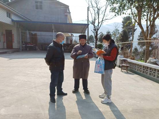 镇人大代表、黎明村村主任文帮朝为川陕结合部的群众发放疫情防控宣传资料。