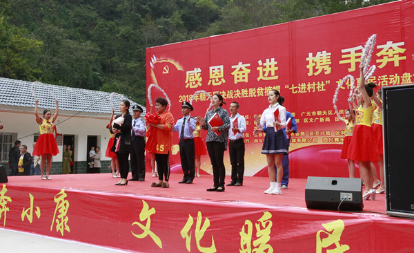 在“七进村社”文化惠民活动中,区委宣传部、区司法局、区卫计局、区文广新局、区林业和园林局、区农业局等部门分别设立了咨询台、宣传展台,向群众开展了区委七届五次全会精神等政策宣讲、法律知识宣传、种养殖技术咨询、义诊活动,区内的书法家们还为群众赠送了倡导乡风文明的书法作品。《不能争当贫困户》、《勤劳致富最骄傲》、《小康路上追梦人》等一批接地气的文艺节目表演赢得了在场群众的阵阵掌声。文艺表演中穿插的知识有奖问答环节,让全体村民在轻松愉快的氛围中进一步了解了脱贫攻坚政策,提高了知晓率和满意度,进一步增强了群众的脱贫信心和内生动力,受到了群众的一致好评。此次活动的开展,正式拉开了盘龙村接受退出贫困村验收工作的序幕,吹响了盘龙这个贫困村向小康村奋进的号角。